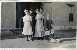 (l-r ) Stella Turner, Jewel Turner, Bess Elliott, Earl Turner, and Verna Turner at the north end of the Empire Ranch House, ca. 1909. Courtesy of Jim Loushin.