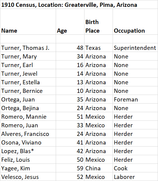 Tom Turner, who was the Empire Ranch foreman in the 1890s, returned as superintendent of the Empire Ranch in 1909. His wife, Mary, and four children, Earl, Verna, Jewel, and Stella, accompanied him. During this time period Bess Elliott was hired to teach the Empire Ranch children, and she lived with the Turners.