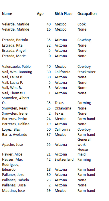 The 1920 U.S. Census reveals how farming had become a part of Empire Ranch operations. The farm was located along Cienega Creek, north of headquarters. Dusty recalls: “It was like a separate enterprise from the ranch proper. That was all agricultural. There was a farmer in charge down there. Because they could irrigate down there, they grew alfalfa mostly. I don’t remember their growing anything but alfalfa, to tell you the truth. They’d bale it every year, you know, and then take it on up and put it in the barn.” [Dusty Vail Ingram oral history, 1993]