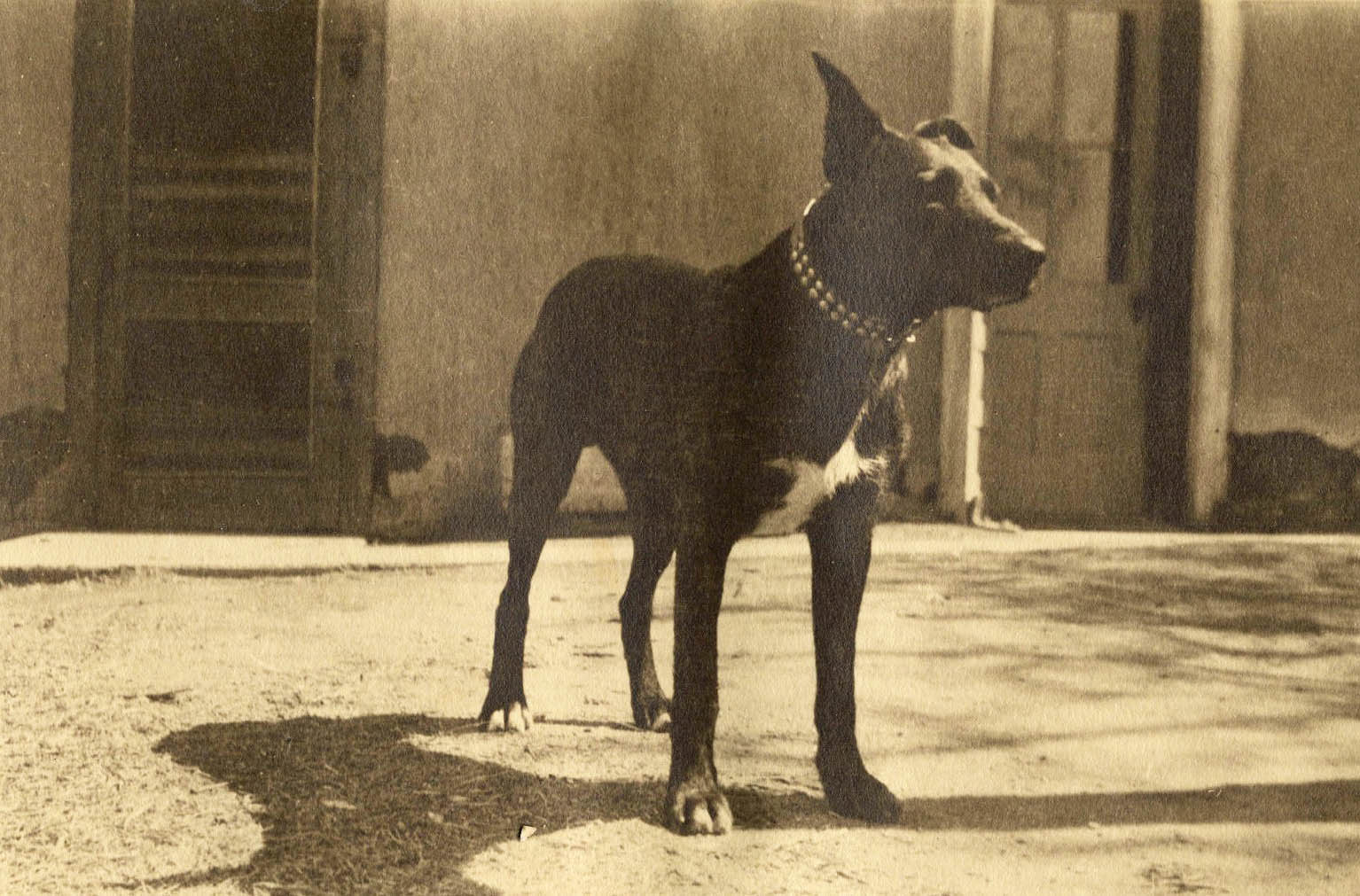 Ranch dogs are ever present, but some are special. Dusty recalls: “Bo, as I say, was half pit bull and half Airedale, and he was trained to ride on the running board. That was the only place he could be, was on the running board, on Dad’s side of his car. And then what he’d do with that Dodge [roadster], it was so high off the ground, he could drive any place on the ranch there. And if he’d see a cow that he wanted to check, or a steer, or whatever it was, he’d sic Bo on it, and Bo would pull it down. And Dad could go up and check it, and then on they’d go. And then he decided that Bo needed some exercise, so he’d have him jump off the running board and run for a while. And that was great with Bo, until he got tired. Then he was smart. What he’d do would be to get in the road in front of the car and slow down, you see.” [Dusty Vail Ingram oral history, 1993]