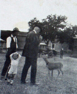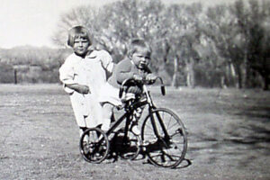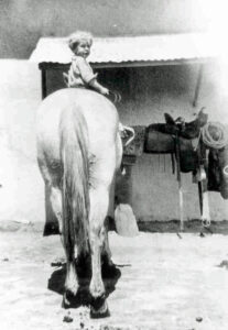At about age 6 Dusty had a horse-riding accident. She recalled: “I was leaning over to open this gate when my horse shied, and so my left foot went through the stirrup and he dragged me and finally kicked me loose. And then I had a big decision to make, what to do. So at first I thought, ‘Well, I’ll go up to Mr. Johnson,’ who was in the blacksmith shop. I had a case on him. …he was a wonderful man. So I decided I’d better go home, so I went on around…I went in the door into the middle room. And just when I hit the door, of course I knew I had help, so I just fell forward. Of course poor Mother nearly died when she looked up and saw this little bloody mess falling through the door. And it was maddening for her, because there wasn’t a single mode of conveyance at the ranch at that moment. Dad was down at the farm with his car. The truck was on a run to Sonoita or something. There wasn’t anything to go down and get my father, or to get me into Tucson. And she finally told Apache Joe to hitch up the chuck wagon! Well about that time the truck driver got back, so he went on down to the farm and let Dad know. And of course then they took me on into Tucson.” [Dusty Vail Ingram oral history, 1993]