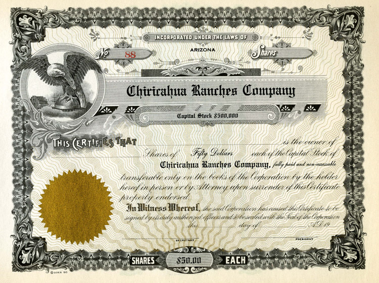 On August 19, 1929 the Empire Land and Cattle Company Board of Directors held a special meeting to convey the lands of the Empire Ranch and other Vail Company properties to the Chiricahua Ranches Company. The contract was signed by Margaret Vail, N.R. Vail, Mary Vail Wilkinson, William Banning Vail, and Mahlon Vail. The CRC was represented by Henry G. Boice and Frank S. Boice. The ranch livestock was not included in the sale.