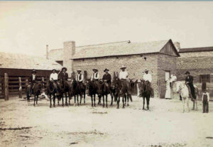 Pauba Ranch cowboys by the railroad tracks south of the Murrieta Creek in Old Town Temecula, ca. 1900. The main building in the background, the two-story, is Hotel Temecula, which is still standing. Courtesy of the Temecula Valley Historical Society.