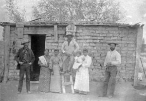 Chappo Miranda (on ladder) with his family and Empire Ranch foreman, Hadden McFadden (left) and manager Harry Heffner (right), ca. 1900. ERF archives: A536-115.