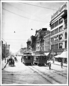 Los Angeles streetcars on Broadway, ca. 1908. Courtesy of University of Southern California Libraries and California Historical Society.
