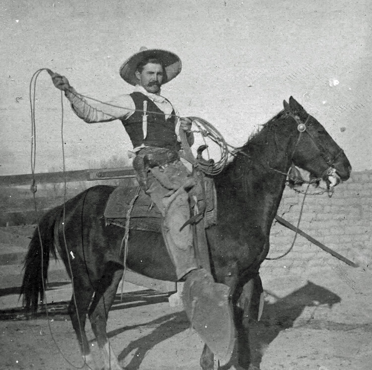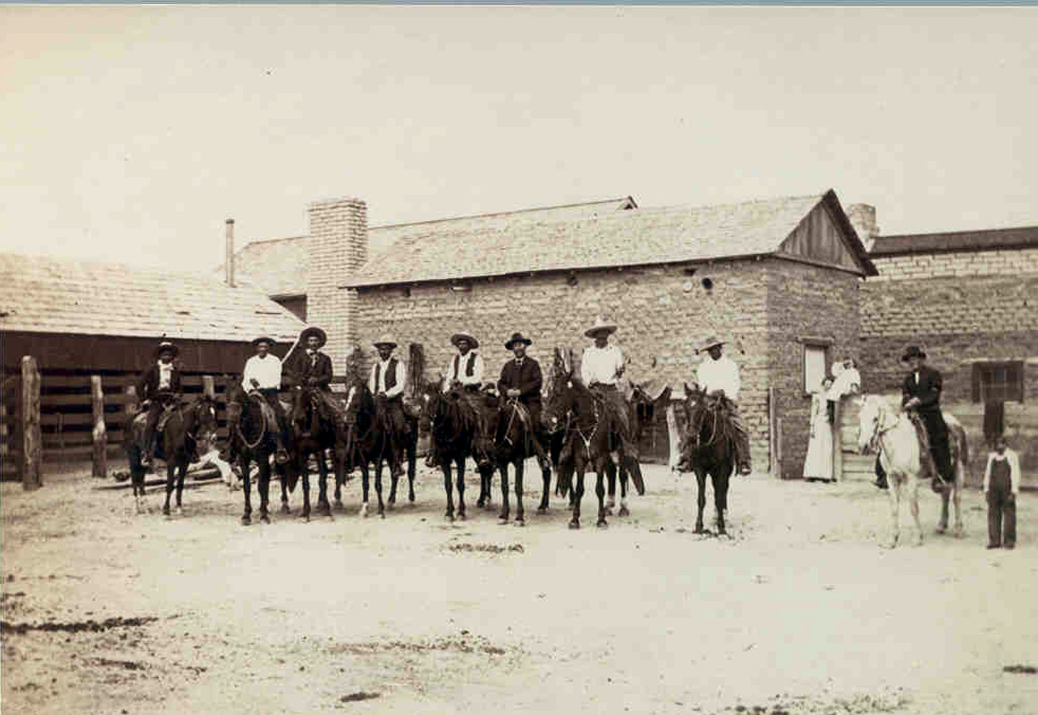 Men who drove 900 cattle to California in 1890. Left to right: Chapo Miranda, Jose Blas P. Lopez, George E. Lopez, Nestor [last name unknown], Francisco [last name unk], man in black outfit is Ranch Foreman Tom Turner, Jesus Elias, Rafael [last name unk], and rider in black on white horse is Edward L. Vail. ERF archives: A300-037