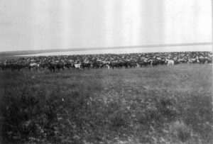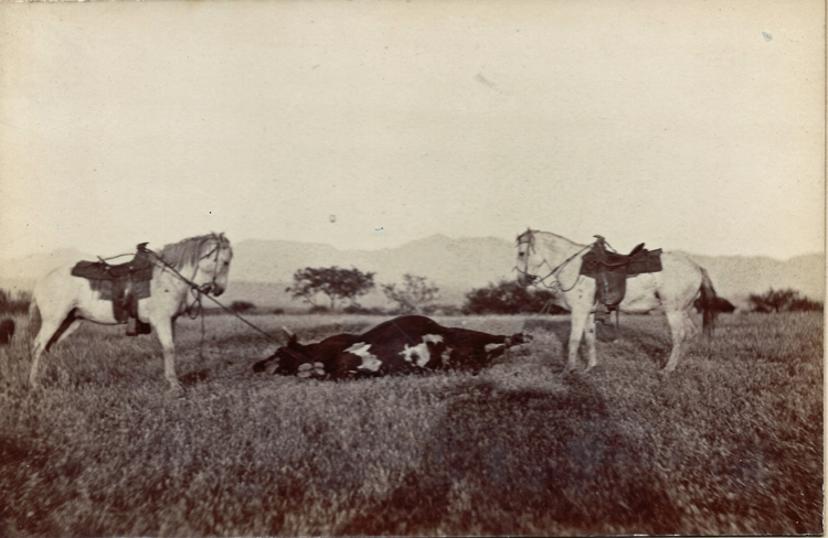 We followed the general directions of the S. P railroad. The watering places were from 15 to 20 miles apart until we reached Maricopa, but several times we had to water in corrals. That night we camped between Casa Grande and Maricopa. Turner and I concluded we would try to get a good night’s sleep for once. We had been sleeping with all our clothes on and our horses ready saddled near us every night since we left the ranch, but as the cattle had been more quiet than usual for several nights past, we concluded to take off our outside clothes and get a more refreshing sleep. Sometime near midnight I awoke and was surprised to find we were in the middle of the herd and a lot of steers were lying down all around us. I awoke Tom quietly and asked him what he thought of our location. He answered, “The only thing to do is keep quiet. The boys know we are here and will work the cattle away from us as soon as they can do so safely. If the brutes don’t get scared we will be all right.”