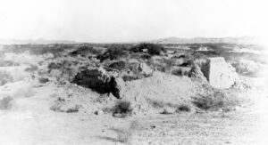 The next day Turner and I thought we would take a ride over to Indian Wells, the next watering place. We easily found the water and the ruins of the old stage station. This is near what is called Signal Mountain, a very peculiar peak the only one I saw in the desert as the country all around is very level. The water at Indian Wells was in a round basin with mesquite trees growing all around it. While we were there Turner’s horse was taken sick and seemed to be in considerable pain. We laid down under a tree to rest. I soon fell asleep. Some kind of bird cried over my head and made a noise like a rattler.