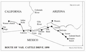 Rather than accept the Southern Pacific Railroad price increase Tom Turner, foreman of the Empire Ranch, and Edward “Ned” Vail volunteered to drive 900 steers overland to the Warner Ranch.