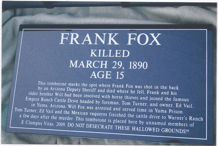Tom Turner was not in camp when this happened as he had gone out around the cattle. The sheriff and his posse left shortly after and took their prisoner with them, but they left the body of young Fox lying on the ground where he fell. We dug a grave and, wrapping the young man’s body in his blanket, buried him near the place where he fell. It was the best we could do. I saw a man in Tucson last week who told me he was at Carrizo Creek a few years ago where he saw the grave which had a marker with the inscription, “Murdered.”