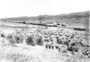 We followed the old stage road down to where it left the river. I have forgotten the exact distance, but it could not have been over 20 miles. In this place there was quite a lagoon of water, so we camped there. Next day Tom and I followed the old road out into the desert looking for water for our next camp. We rode a good ways that day and came back to camp late quite discouraged as owing to the poor condition our cattle we were afraid of driving them a long distance without water. When we reached camp we were surprised to find several tents pitched close to us on the lagoon. We immediately inquired of our men as to who the people were. They did not know but thought they were engineers of some kind. Tom and I went over to see and introduced ourselves to the head man.
