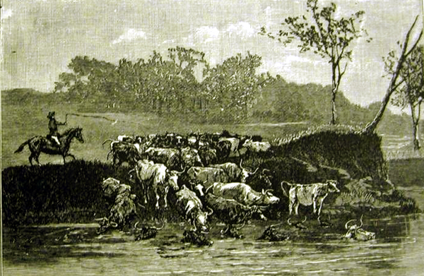 The herd had not been watered since the day before in order to make them thirsty. The current was very strong and the river very deep. We found it would be impossible for men on horseback to do anything in guiding the cattle across, so we hired the Indians and three or four boats. We placed them so as to keep the cattle from drifting down stream. The idea was not to let them turn back for land so far down as to miss the island. We got the cattle strung out and traveling as they had on the trail with the big steers in the lead and men on each side to keep them in position to go down the grade which we had made to reach the river. Most of the large cattle reached the island all right. Then our troubles began!