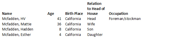 The 1900 U.S. Census provides an interesting view of Empire Ranch operations. At the Empire Ranch headquarters we find the McFadden family: