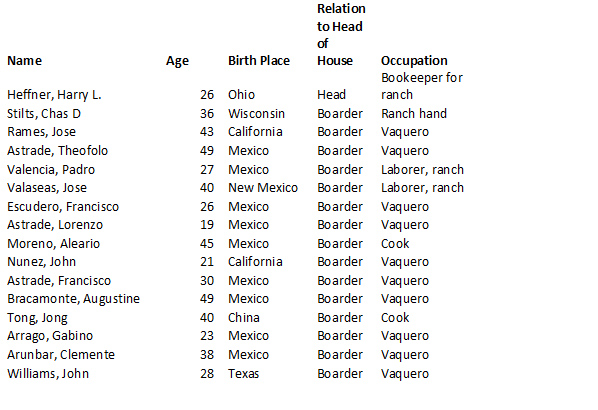 At the Rosemont section of the Empire Ranch we find a large grouping of vaqueros. The census was taken in June so it’s possible that some roundup operations were happening at Rosemont at the time.