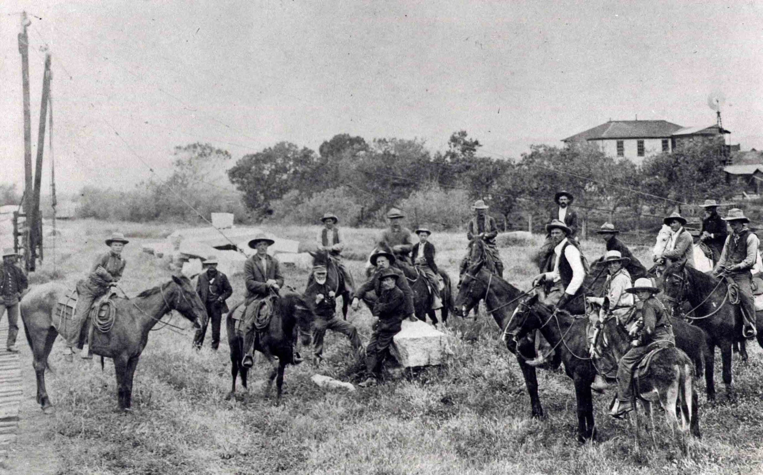 Pauba Ranch cowboys by the railroad tracks south of the Murrieta Creek in Old Town Temecula, ca. 1900. The main building in the background, the two-story, is Hotel Temecula, which is still standing. Courtesy of the Temecula Valley Historical Society.