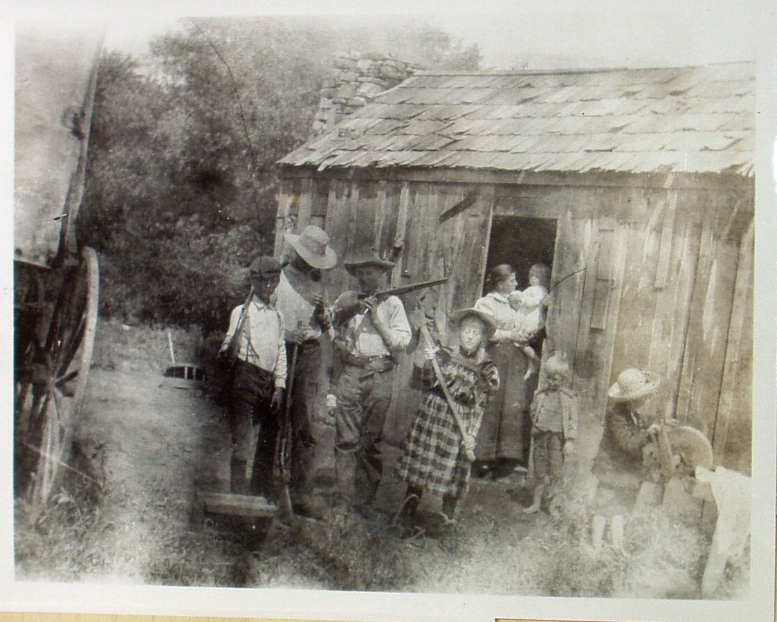 Vail family at Leon Conyer’s Mescal Springs Ranch in Whetstone Gap. Margaret Vail in doorway holding Margie. Mahlon, Russ, Walter, Amy Scholefield are also in the picture, 1898. ERF archives: A510-107