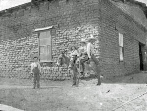 Chappo Miranda (on ladder) with his family and Empire Ranch foreman, Hadden McFadden (left) and manager Harry Heffner (right), ca. 1900. ERF archives: A536-115.