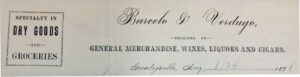 A letter from Barcelo & Verdugo, proprietors of a general store in nearby Greaterville, responding to Empire Ranch foreman, Hadden McFadden, provides a glimpse into interactions between the Empire Ranch and a local community. “I must confess that the contents of you letter has greatly surprised us as you holley [sic] blame us for misconduct or wrongdoing of Jose Velaquez. This time when he came to our store he was intoxicated & get his liquor somewhere else; when I learned he was on some errand from the ranch I advised him to do his business immediately and return home. This he promised to do and I thought he had been to the ranch & perhaps returned as I have seen him here since and sober. Of course we thought he was here with your permission.”