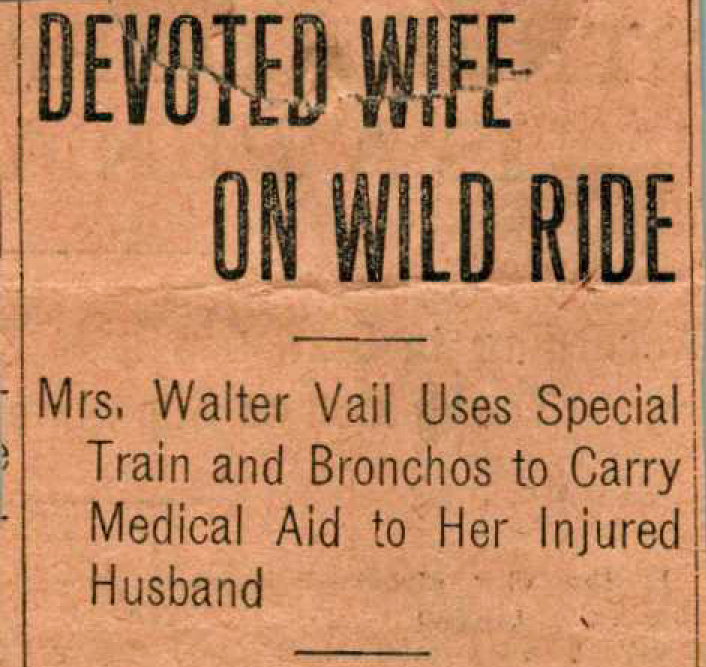 The round up season was in progress on the Warner ranch, San Diego county, in which Mr. Walter Vail is part owner. His presence was due to a desire to recuperate from an attack of illness. He entered Into the spirit of the occasion, and while in me Tuesday afternoon was riding rapidly, both cinches of his saddle either broke or slipped in such a manner that the saddle turned and Mr. Vail was thrown violently to the ground. He tried to save himself and his horse becoming frightened, he was dragged a considerable distance before he let go his hold on the horse. Walter G. Martin of Los Angeles, who is also a part owner of the ranch, happened to be nearby in a buggy and the injured man was brought to Warner Hot Springs, a distance of only four miles. It Is known that several of his ribs were fractured by the fall and it is believed he also sustained internal injuries. Upon arrival at the springs a telephone message was sent to Mrs. Vail at Los Angeles, and she replied that she would leave at once on a special train accompanied by the family physician. The train was run to Temecula and from there it was necessary for her to take a forty-mile drive.” [Arizona Daily Star, 10/6/1905]