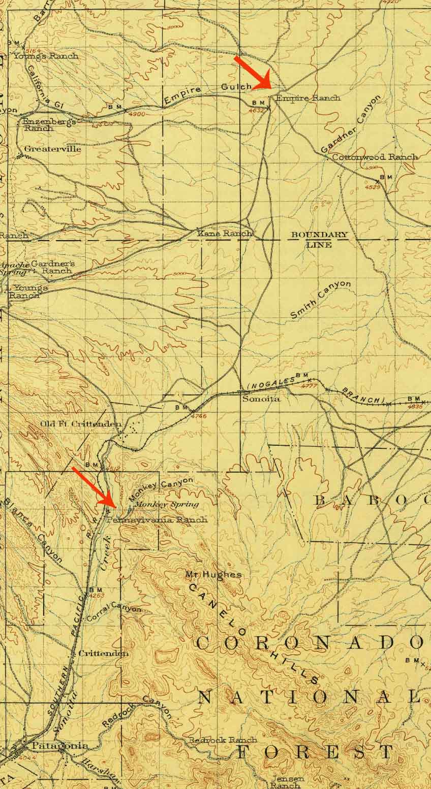Vail, Gates, and Oscar Ashburn purchased the Crittenden Land and Cattle Company on September 7, 1901, from pioneer rancher Rollin R. Richardson. The Crittenden property encompassed 5,280 acres which included Richardson’s Pennsylvania Ranch in Monkey Springs Canyon.