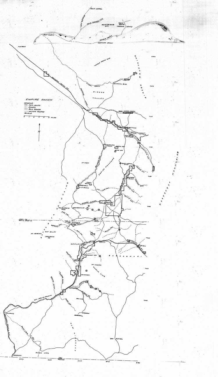 By late 1909, in an amicable settlement, Gates deeded to the Vail heirs his interest in the Empire Land and Cattle Company, the Pauba Ranch Company, all land scrip in the name of Vail and Gates, his one-fourth part of the Crittenden Cattle Company, all interest in Warner’s Ranch, and half-ownership of a California land development company. In exchange, the Vails gave Gates their 4,034 shares of the Chiricahua Cattle Company stock, all interest in the Panhandle Pasture lands extensive real estate holdings in Kings, Kern, Fresno, and Los Angeles Counties, all 52,556 of the Vail shares in the Huntington Beach Company, and a cash settlement of $64,375. [Gregory Dowell, History of the Empire Ranch, 1978]