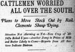 Walter Vail was interviewed for an article about the drought conditions “The loss of stock has as yet been small,” said Walter L. Vail of Vail & Gates. “The old feed on which stock is now grazing is in fairly good condition. Heavy rains might beat it down, wash out the nutriment and cause it to rot so as to destroy its value for stock. In that event there might be a few weeks before the fresh feed has grown in which stock would have pretty thin picking. As is usual at this time of year Southern California is now drawing from the regular supply in Arizona. Should there be no rain here, the effect on the beef supply would not be great until next summer or fall. On the Arizona range too principal precipitation of moisture is in the spring and summer, so there is no special concern regarding the weather conditions there now. “Of the beef consumed in Southern California, about 25 per cent is raised and fattened in Arizona and killed here. About 50 percent is bred in Arizona and shipped to Southern California as feeders. These feeders, when fattened here, are killed for local consumption. About 25 per cent of the beef consumed in Southern California is born, bred and fattened here. Both in consumption and output Southern California is not much affected by Northern California conditions. [Los Angeles Times, 1/27/1904]