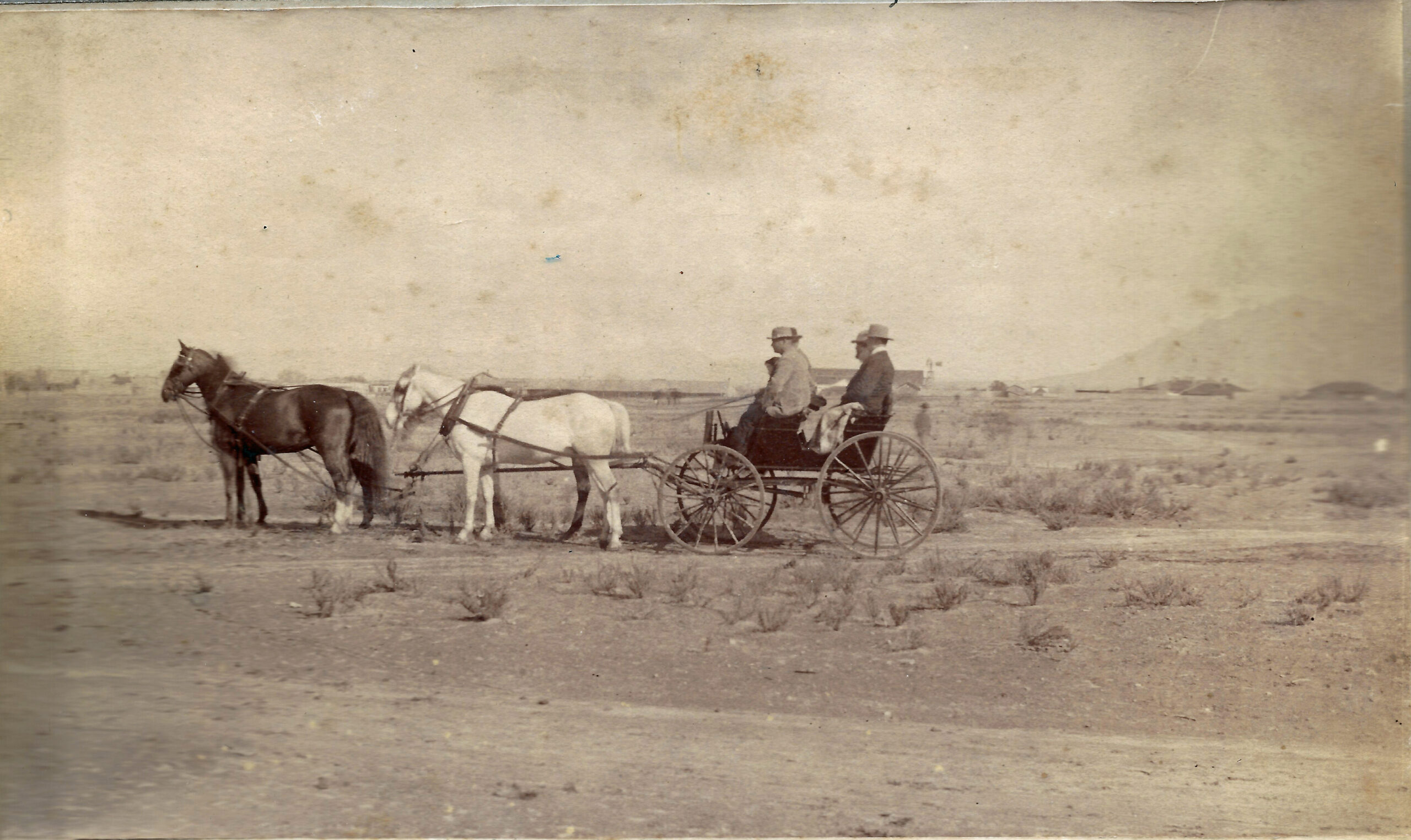 Looking north across the military plaza in 1890 from 6th Ave & 14th St. in Tucson. 4 men in a horse-drawn carriage.
