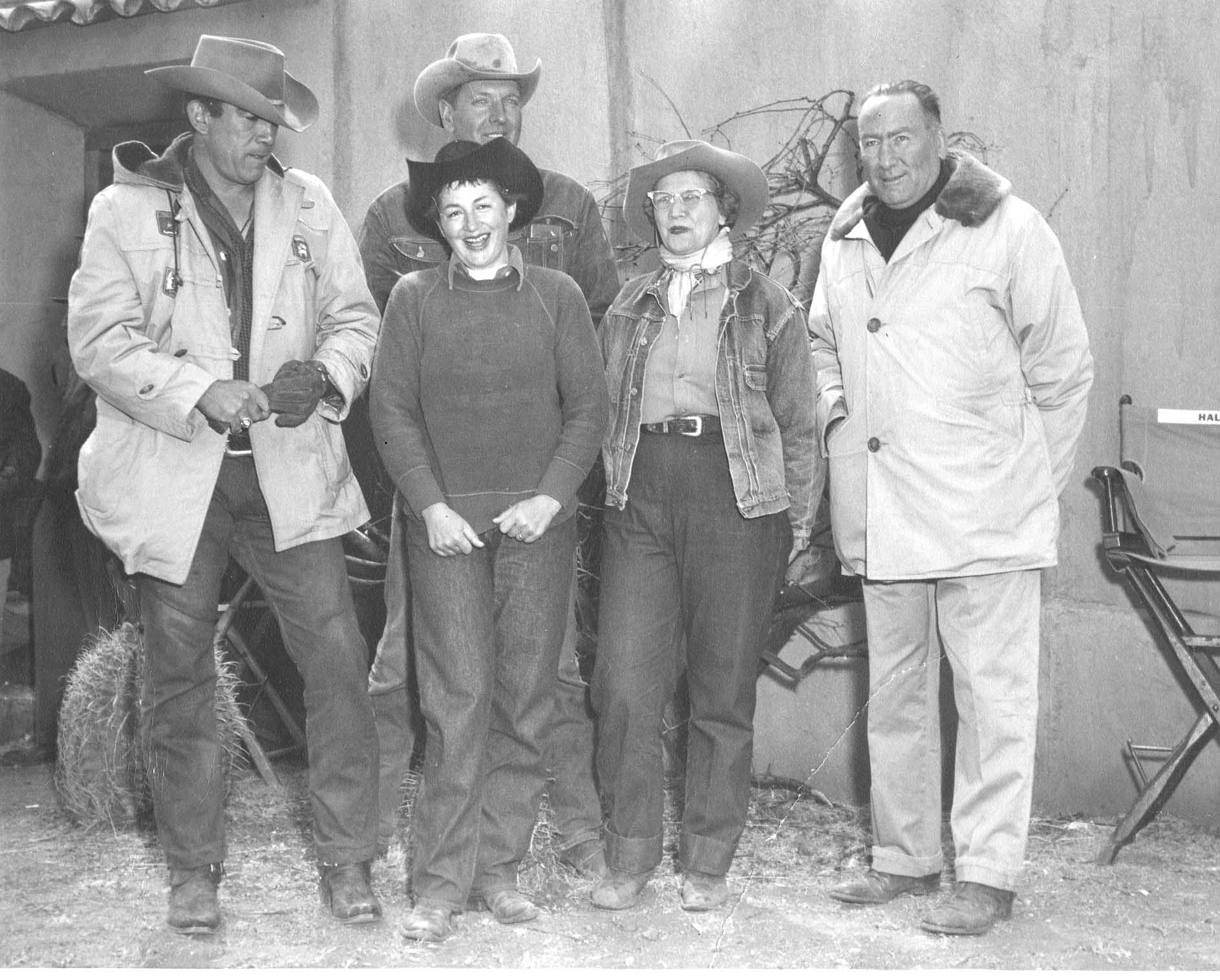 Anthony Quinn, Mary & Bob Bowman, Mary Boice, and Director Hal Wallace, on site while Last Train from Gun Hill was being filmed on the Empire Ranch, 1958. ERF archives: B004-1