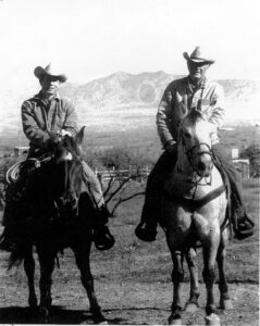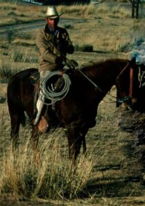 The photo illustrating this post resulted when Mary Boice suggested to Mary and Bob Bowman, who had been branding cows, that they drive over with her to see the film site. On nearing, someone came running over saying “you just ruined a take by driving through it.” However, when Mary Boice gave her name, they were cordially escorted to film site. There, Hal Wallace was very gracious, inviting them to dine. Mary Bowman explained her smile is strained in this photo, as she had accidentally backed up into a barrel cactus when shot was taken.