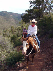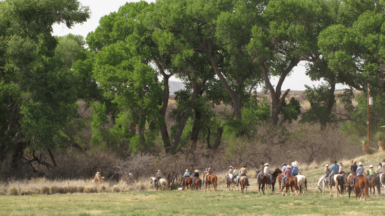 Cottonwood grove behind riders at the Empire Ranch Foundation Spring Trail Ride, 2010. ERF archives: D453-057