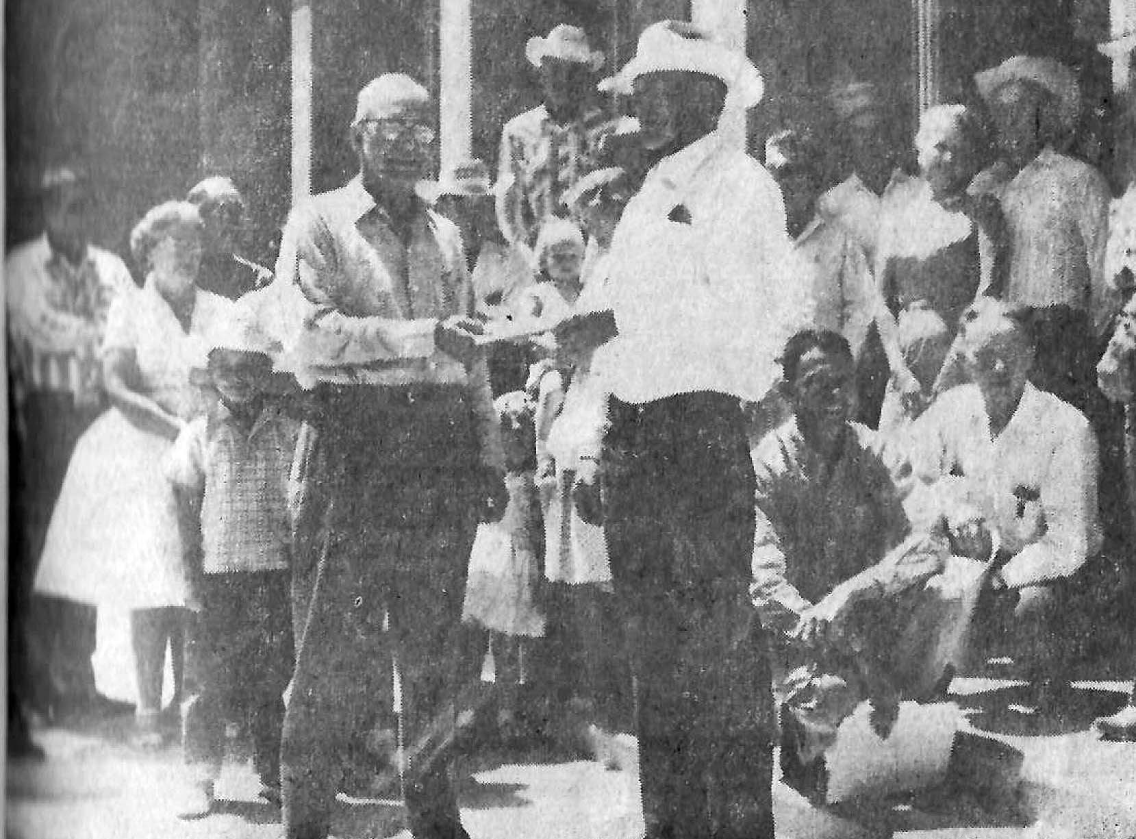 (l-r} Earl Horrell, President of the Gila County Livestock Protective Association presents reward to ranch hand Earl Prosser, 1961. Arizona Record photo.