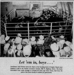 “The entire breeding herd of the Empire Ranch has been sold at auction in Tucson scattering forever some of the finest Hereford bloodlines in the Southwest Brought to Arizona in 1912 from the sprawling XIT Ranch in Texas the herd has been the pride of the Boice family in Sonoita for generations. The herd belonged to the family of Robert G. Boice of Globe and to the estate of his late brother Frank. In a matter of a few hours the 890 animals — including 70 bulls — that had taken nearly three weeks to round up had been dispersed among 18 buyers. The bulls brought an average of $347 a head. The pregnant cows brought an average of $256. Boice sat with his family at the edge of the sale ring after the crowd had dissipated and stared out toward the stock pens. He tugged at his Stetson and remembered aloud that cows from the same herd had brought $300 each in 1951. The Boices’ brought the cattle to the Empire Ranch from another part of the state in 1928. Forty years later the ranch was sold to Gulf American Corp. About a year ago GAC sold the property to Anamax Inc. The mining company did not renew the Boices’ grazing lease and the family had no other spread suitable for the herd so it had to be sold.” [Tucson Citizen, 12/20/1975]