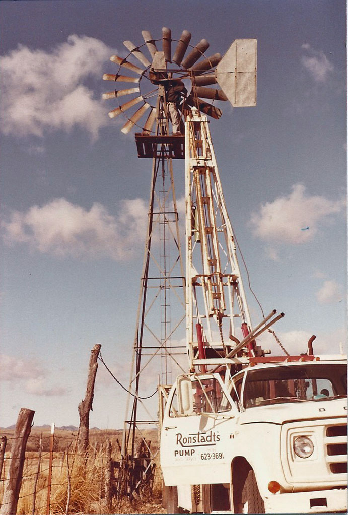 Empire Ranch windmill being serviced by the pump department of Ronstadt’s Hardware, 1970s. ERF archives: C520-121